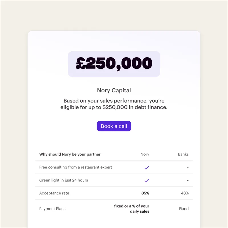 Nory Capital offers loans of up to £1.3 million (£2 million exposure) to restaurant businesses. The amount you qualify for will depend on your restaurant’s specific needs and financial situation.